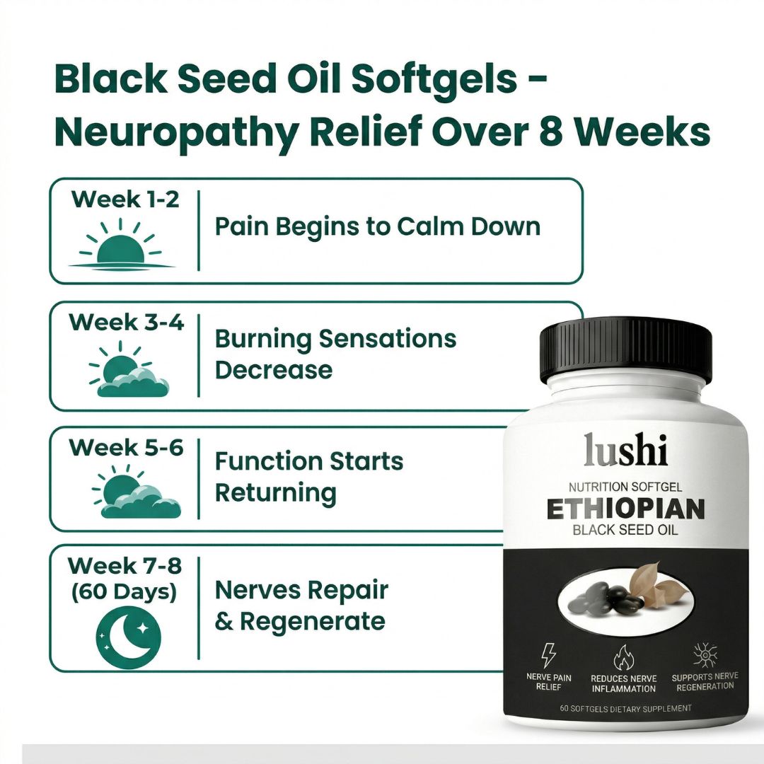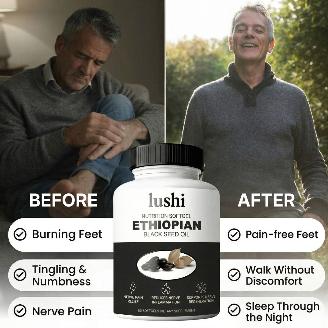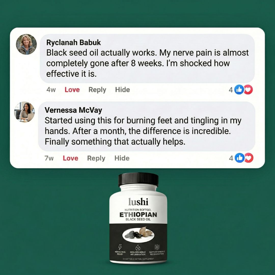 Ethiopian black seed oil stops inflammation at its source. When you have neuropathy, inflammatory molecules attack your nerve fibers, causing burning, tingling, and numbness. Big Pharma's answer? Gabapentin. Creams. Painkillers. They only numb the pain—they never fix your nerves. Here's what's different: The Thymoquinone Nerve-Repair Pathway—Thymoquinone at 4.64% concentration (9x more potent than regular black seed oil)—doesn't mask symptoms. It stops the inflammation destroying your nerves while increasing oxygen delivery. Your nerve cells heal and rebuild connections.